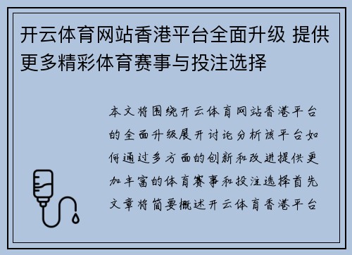 本文将围绕开云体育网站香港平台的全面升级展开讨论,分析该平台如何通过多方面的创新和改进,提供更加丰富的体育赛事和投注选择。首先,文章将简要概述开云体育香港平台升级的背景与目的。接着,从以下四个方面详细探讨平台的提升:1) 丰富赛事种类和增强赛事覆盖面;2) 提升用户体验与界面设计;3) 增强安全性与支付便捷性;4) 推出个性化推荐与智能化投注功能。每一部分将详细分析如何通过具体的技术与策略提升平台的整体竞争力,进而吸引更多的用户。最后,文章将总结平台升级的重要意义,并展望未来可能的发展方向。