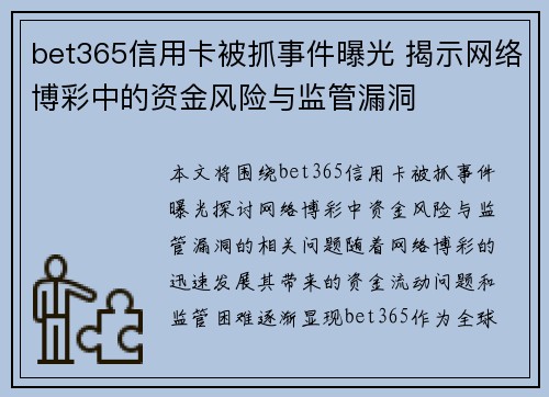 本文将围绕bet365信用卡被抓事件曝光,探讨网络博彩中资金风险与监管漏洞的相关问题。随着网络博彩的迅速发展,其带来的资金流动问题和监管困难逐渐显现。bet365作为全球知名的博彩平台,其信用卡被抓事件的曝光,引发了对网络博彩行业背后隐秘操作、资金安全以及法律监管等方面的广泛关注。本篇文章将从四个角度详细分析这一事件:一是事件的背景及具体情况,二是网络博彩资金流动的复杂性,三是当前博彩行业监管的漏洞与挑战,四是未来可能的解决方案与政策建议。通过这些角度,本文将揭示出网络博彩中存在的资金风险与监管漏洞,并探讨如何完善现行的管理机制,以确保更好的资金安全和行业合规。